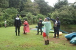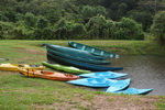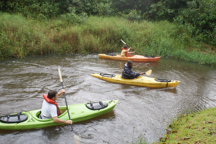 Unser Guide Leo und zwei Mitreisende haben sich bei Regen zu einer Kajaktour aufgemacht