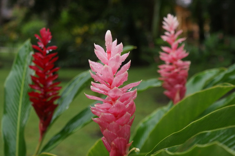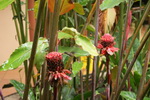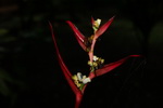 Was die Blütenstände so auffällig erscheinen lässt, sind die intensiv rot gefärbten Tragblätter. Die eigentlichen Blüten sind zierlich und weiß, sie liegen unter den Tragblättern verborgen und sind nur aus der Nähe zu erkennen.