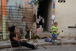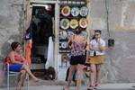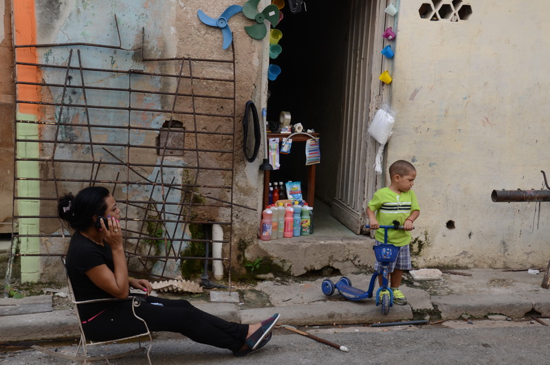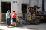 Hier wird etwas aus der Haustür verkauft. Und die Mutter macht es sich auf der Straße bequem.