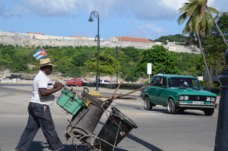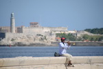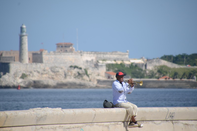 Einsamer Trompeter auf dem Malecón. Im Hintergrund Castillo de los Tres Reyes del Morro.