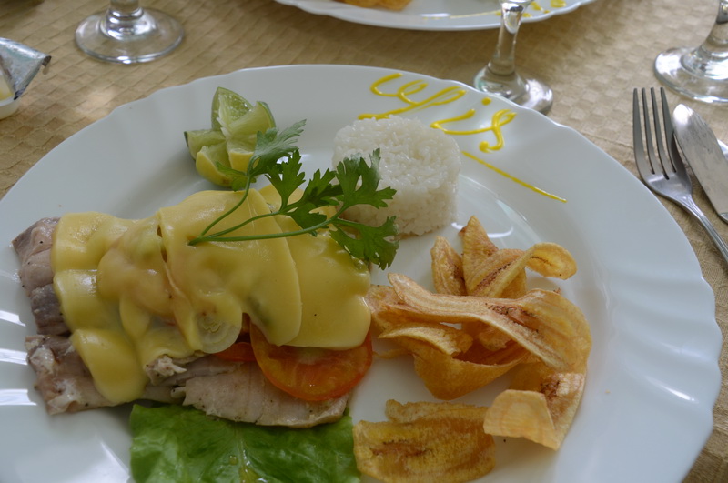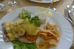 Unser Essen. Etwas gewöhnungsbedürftig. Fisch mit Käse überbacken. Aber liebevoll garniert.