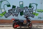 Rot-weißer Flitzer mit Fahrradfahrerin.