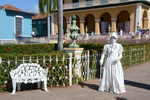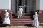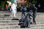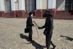 Eine Schauspielertruppe zieht in der heißen Mittagssonne durch die Stadt.