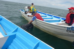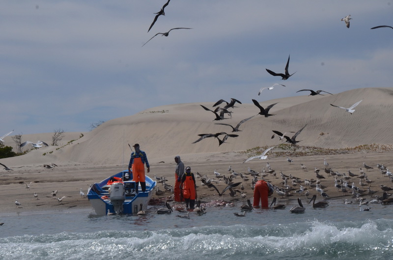 Fischer. Die Vögel stürzen sich auf die Abfälle.