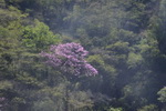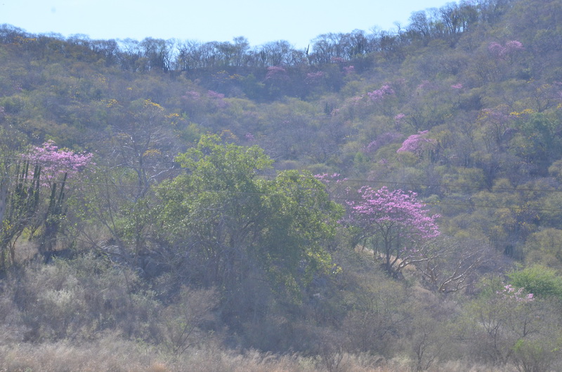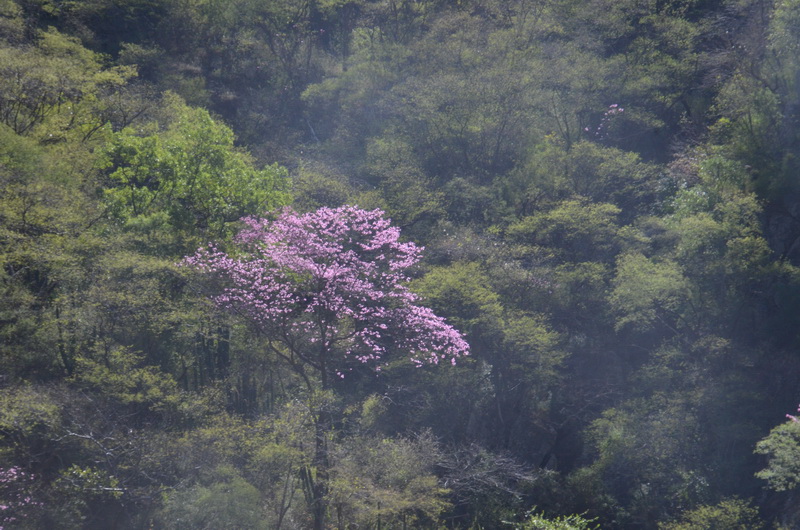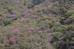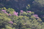 Die Landschaft ist gesprenkelt mit lila blühenden Bäumen
