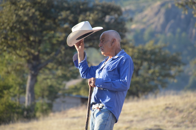 Wir machen uns auf zu einer Wanderung. Der alte Mann ist unser Guide.