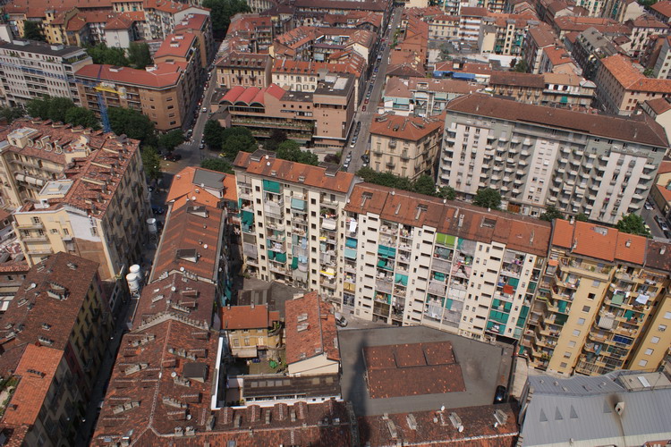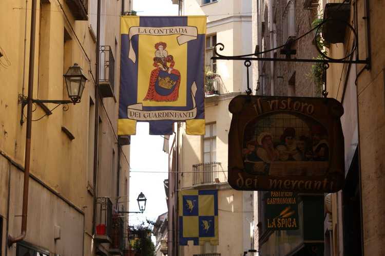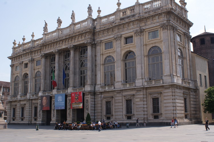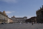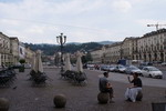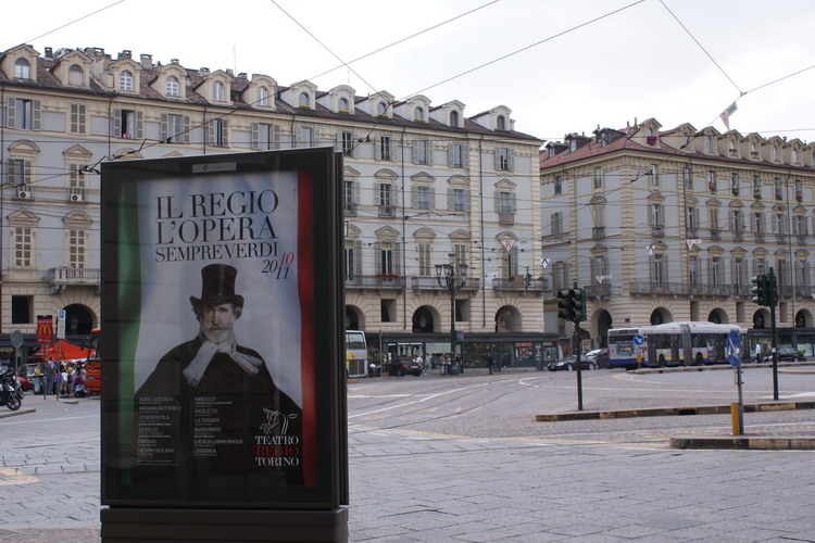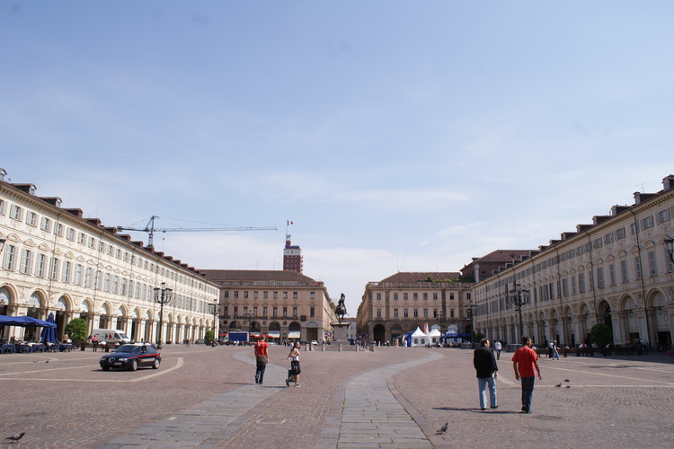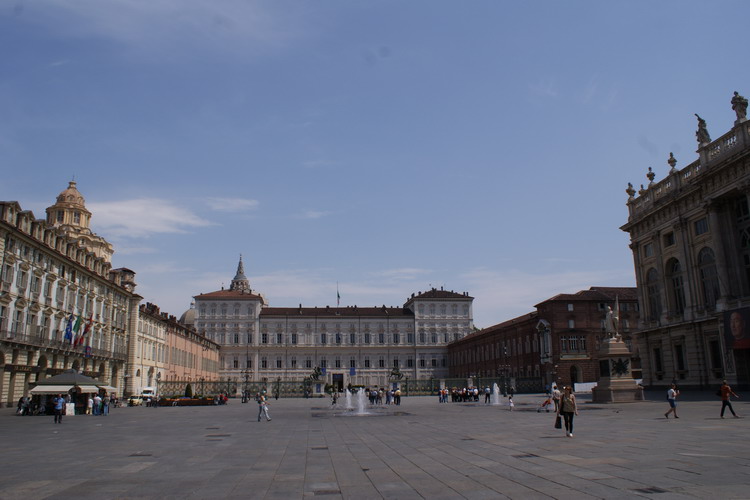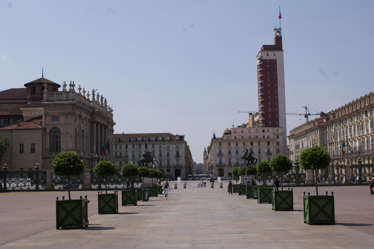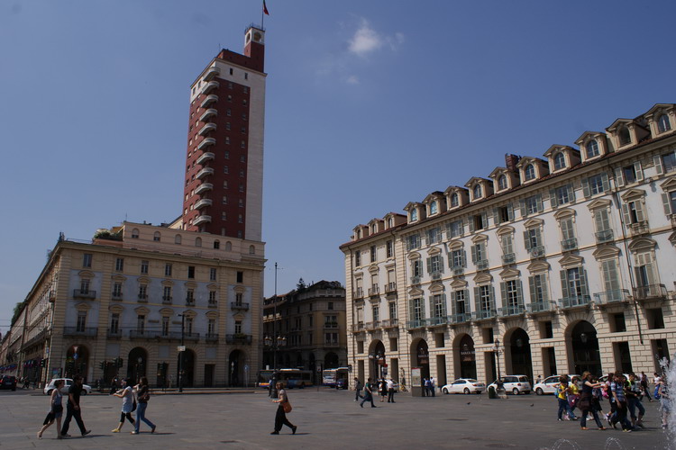 Der Turm beeinträchtigt das ansonsten harmonische Gesamtbild der Piazza Castello ganz erheblich