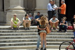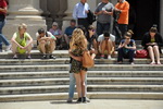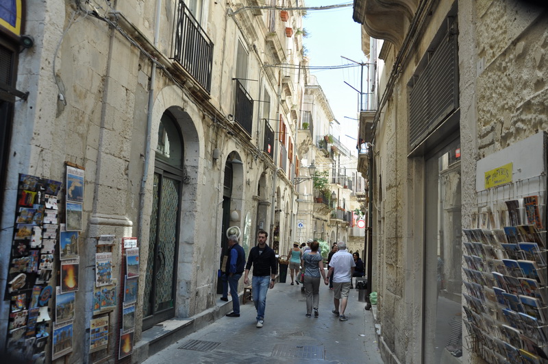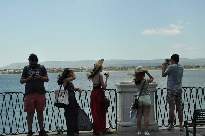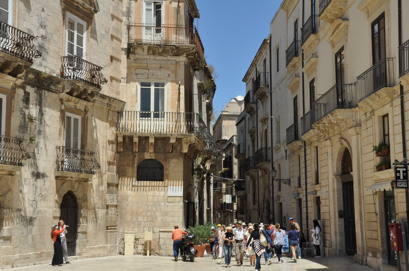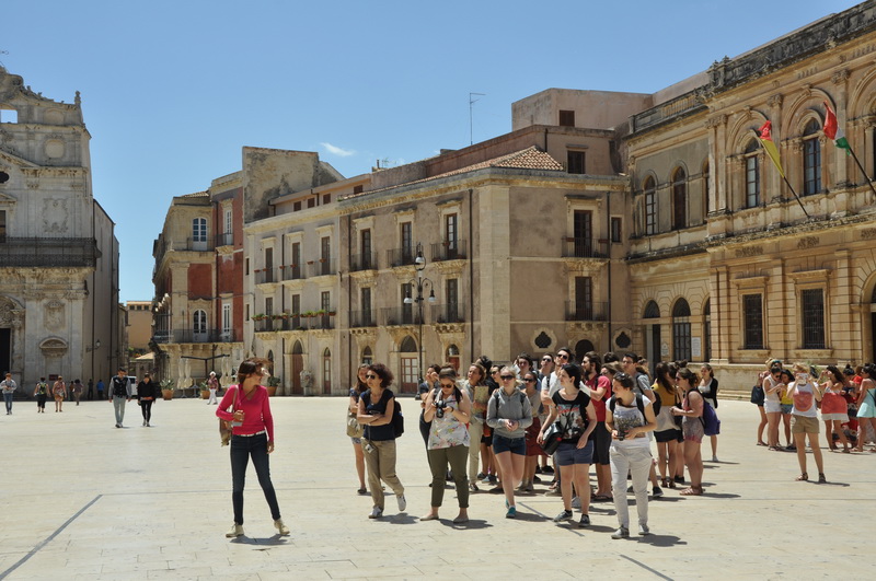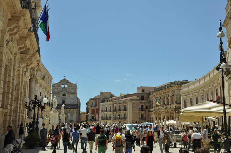 Touristen auf der Piazza del Duomo. Durch die vielen hellen Häuser war es strahlend hell