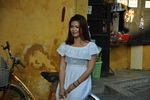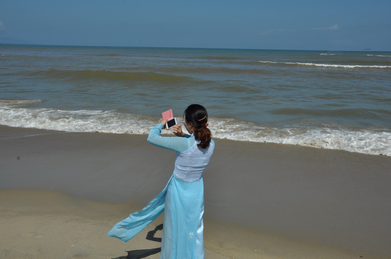 Vietnamesin in typischer Kleidung versucht ein Handyfoto zu schießen