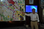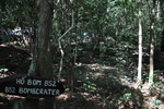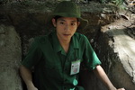 Ein Führer in Arbeitsanzug und grünem Dschungelhut quetscht sich in ein Loch und taucht dann an unerwarteter Stelle in der Laubstreu wieder auf, den Lukendeckel hoch über sich haltend.