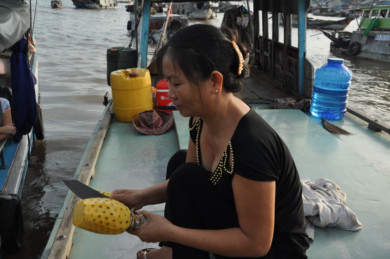 Die Frau unseres Bootsführers hat uns leckere Ananas geschnippelt