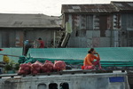 Die vor Anker liegenden Boote lassen Obst und Gemüse von langen Bambusstöcken herabhängen