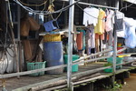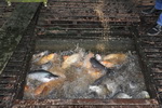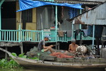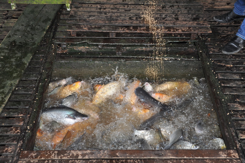 Pangasius Zucht. Unter den schwimmenden Häusern sind jeweils mehrere Tonnen Pangasius