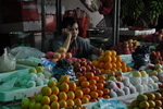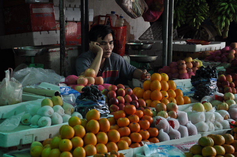 Obststand mit gelangweiltem Verkäufer (und Handy)