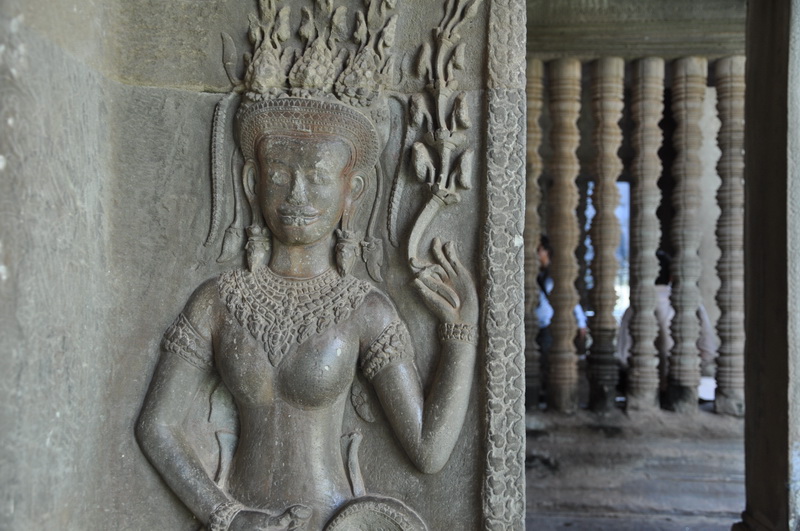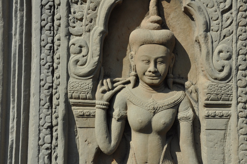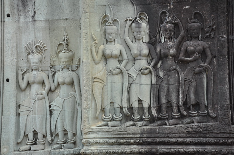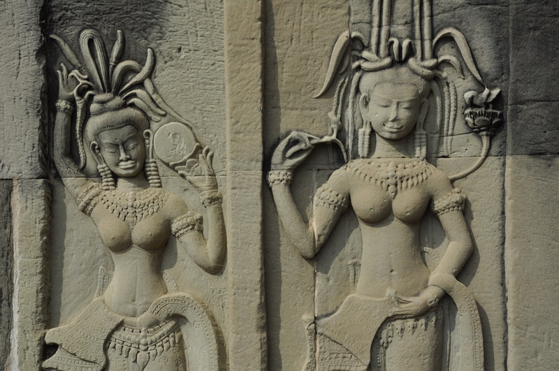 Viele der Tempelwände sind mit steinernen Figuren die Tänzerinnen, sogenannte Apsaras darstellen