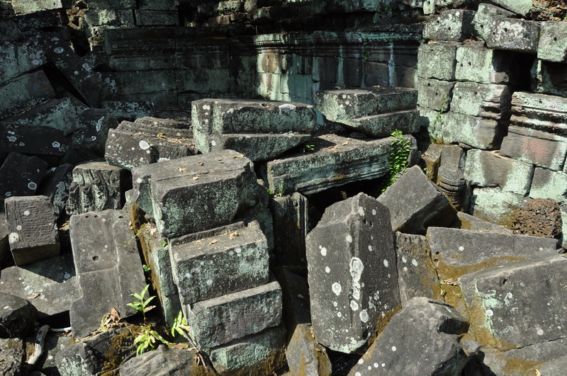 Der schwere, mit Sand gefüllte Kern der pyramidenförmigen Anlage übte Druck auf die dünnen Wände aus. Rund 300.000 Steinblöcke wurden nummeriert und im Dschungel rund um die Anlage verteilt.