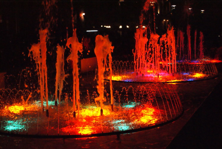 Zu den Wasserspielen mit wechselnder Beleuchtung spielte vom Band klassische Musik.